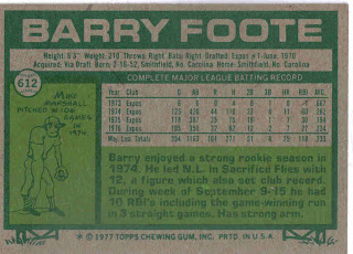 - Barry Foote lost to Gary Carter in the competition for the starting Montreal catching job. On June 15 Barry was traded (with Dan Warthen) to the Philadelphia Phillies for Tim Blackwell and Wayne Twitchell. On both teams Foote was a backup behind a very durable catcher (Carter in Montreal, Bob Boone in Philadelphia). He played in only 30 games during the entire 1977 season.